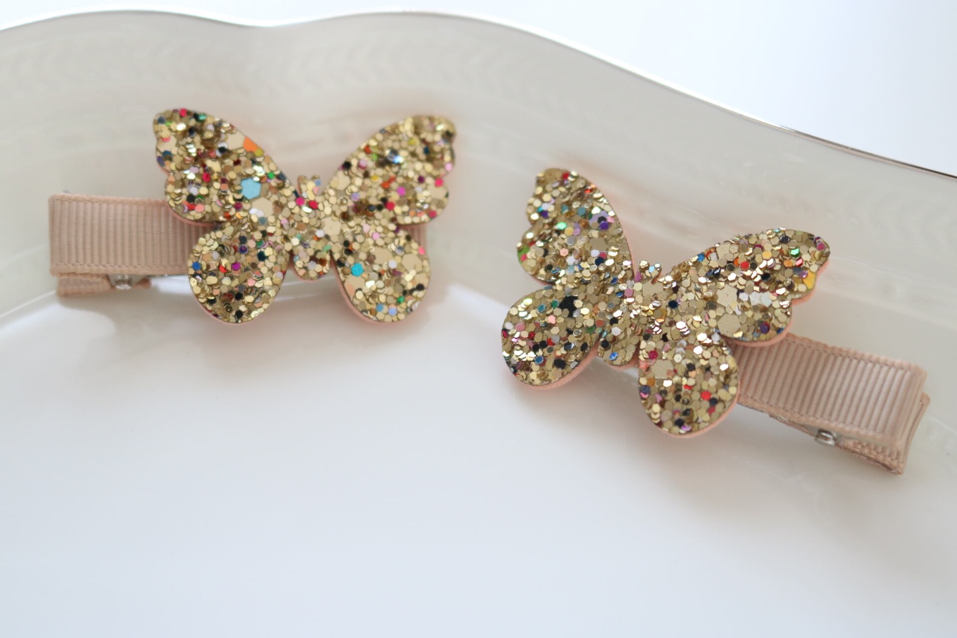 蝶々がモチーフのキラキラのグリッターがお顔周りを明るく華やかにさせてくれるヘアピンです。